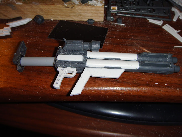 I've cobbled together a few more odds and ends from the IWSP pack to make a double barrelled rifle inspired by Gundam X Divider. I don't think I'm done with the rifle yet it could use a few more details especially where I've used pla-plate to get things held together.