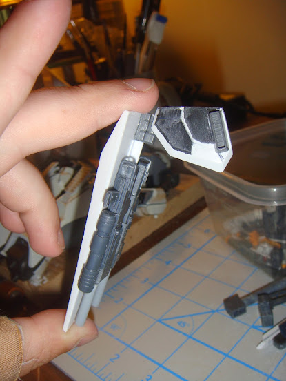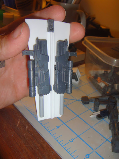 Seeing as this coming Monday is the last day for the build I had best get things in gear again. So I decided to do away with the double barrel beam rifle I had put together and the missile pod on the arm in favour of two smaller machine guns. I extended the barrel on both of them to make them fit the scale a little better.