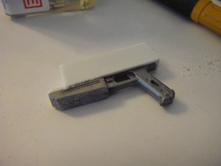 I'm a little stumped as to how to build that so I've focused on the beam rifle for now and I've set my sights on something like the beam smart gun used by S-Gundam (that being one my absolute favourites). I've pretty much maximized the size of it based around Hi-Nu's frame too, so it's gonna be one really big bloody gun. It is the absolute limit of what can fit underneath of the arm and the stock is cut before it gets burned by the boosters.