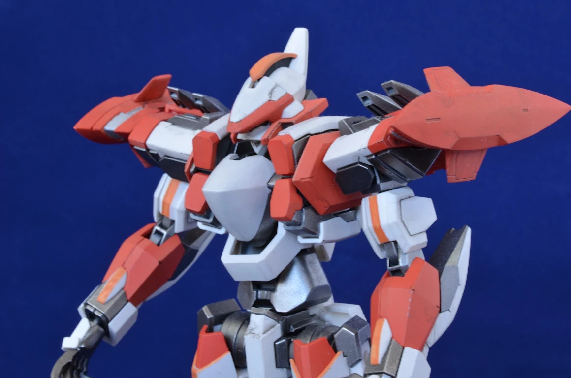 I mixed my own orange paint for this and used a basic white colour from Vallejo for armour parts in addition to some Steel for the inner frame parts. At the end of construction I was pleasantly surprised by how solid the kit was and not overtly tight even after paint.